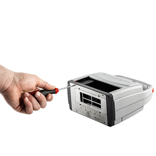 The package comes with four template inserts. Once the stainless steel frame, sized about 155 x 87 x 1 mm, is attached to the base plate, these templates can be inserted at need to ensure precisely positioned and reproducible imprints.